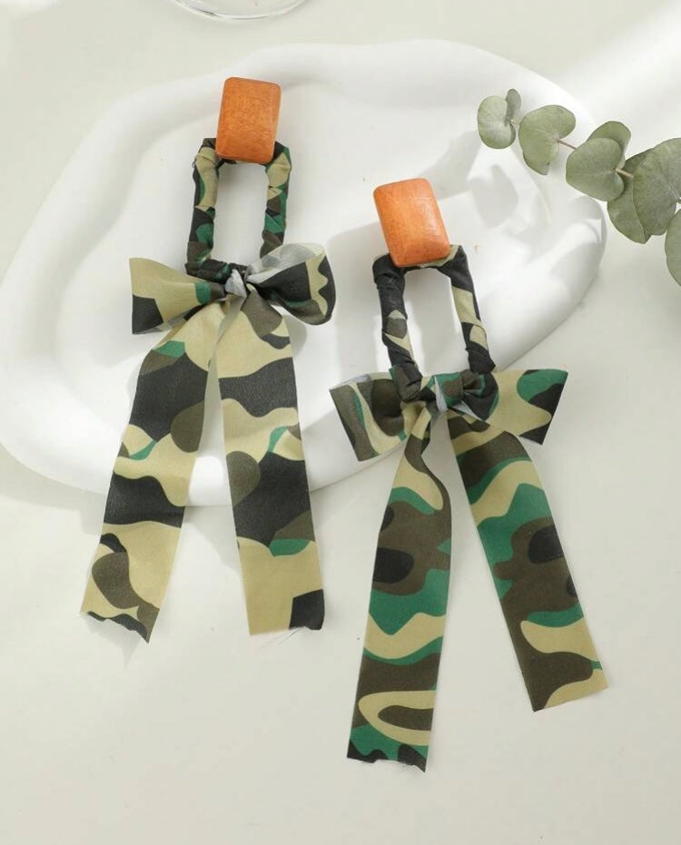 Military Style Fashionable Classic Wood Sqr Camouflage Bow Ear Charms for Daily Casual Wear Unique & Distinctive Earrings for Soldier Girls